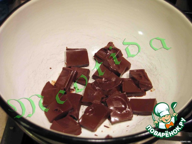 Шоколад положить в огнеупорную миску, поставить на кастрюлю с кипящей водой, чтобы миска не касалась воды и растопить