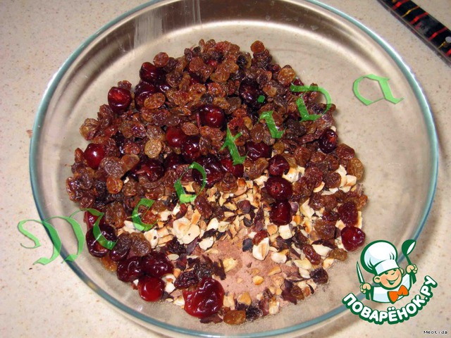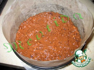 Добавить в шоколадную массу вишню, изюм, орехи, какао, муку и разрыхлитель и смешать все до однородности -