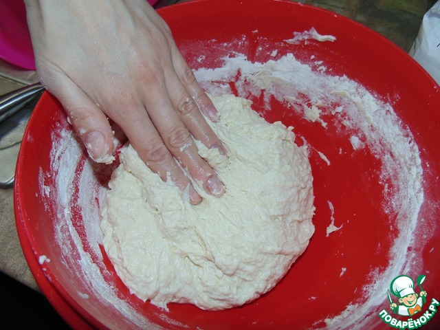 Постоянно перемешивая, всыпать муку. Её может потребоваться больше или меньше, но тесто не должно быть очень крутым.
