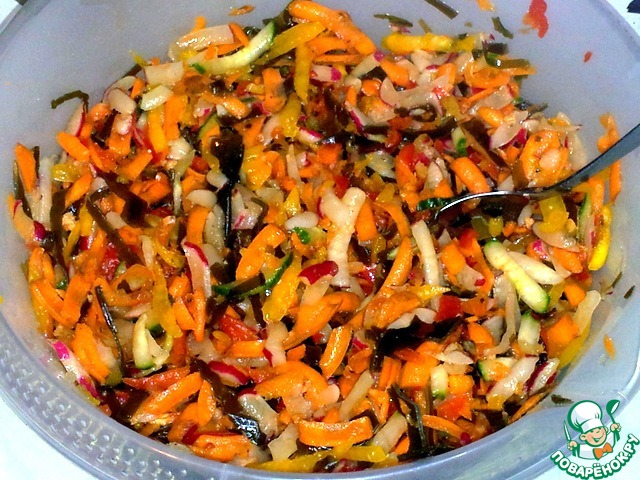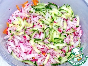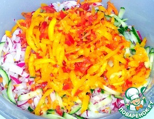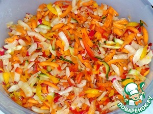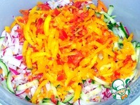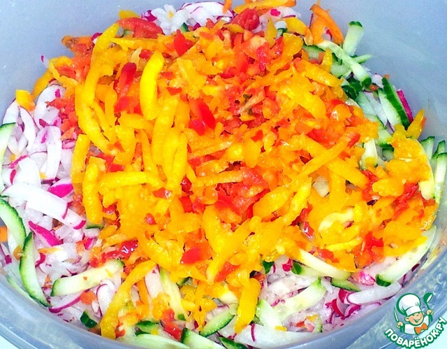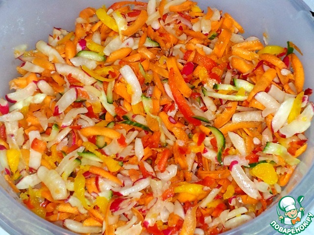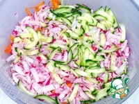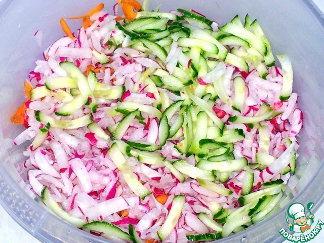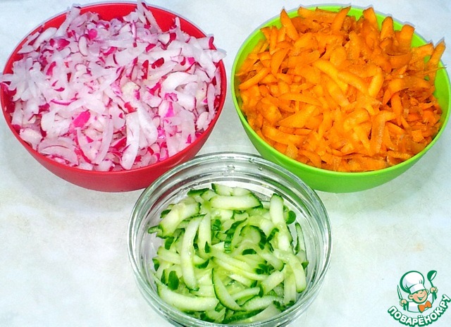 В комбайне натёрла редис, морковь, огурец на средней тёрке. |