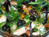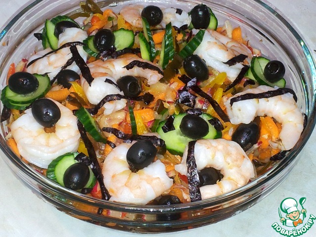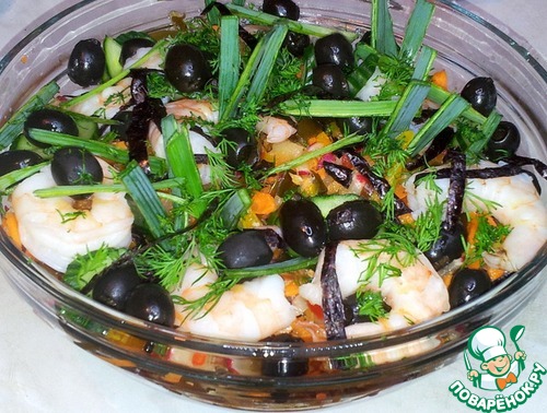 Сверху разложила тигровые креветки. ( Креветки готовые, размороженные ). |
