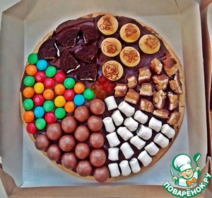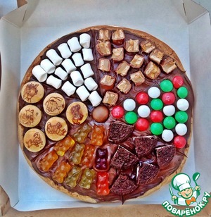 Эту пиццу я украсила зефиром, шоколадными шариками, M&Ms, печеньем Oreo (поделенным на четвертинки) и печеньем Choco Boy, порезанным на маленькие кусочки Snickers. В серединку положила двух мармеладных мишек. -