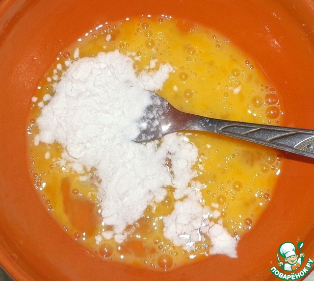 Приготовим яичный блинчик. Разболтать вилкой яйцо. Насыпать к яйцу кукурузный крахмал и размешать.