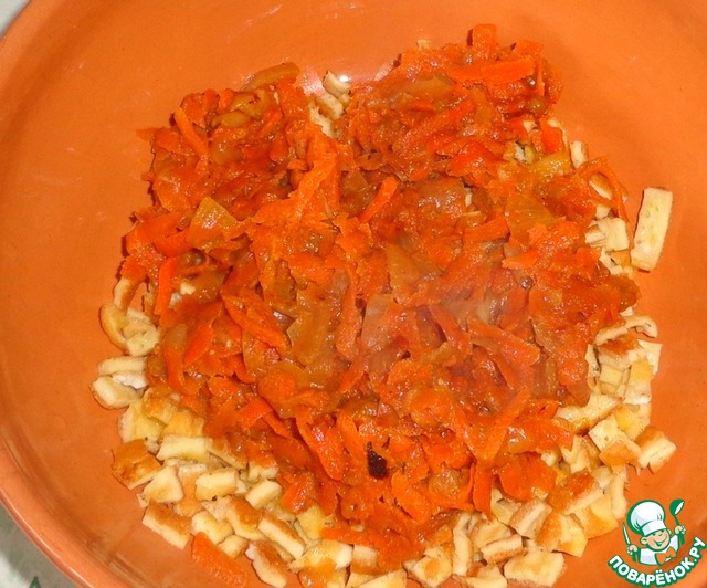 Остудить тушенную морковь с луком. Яичный блинчик мелко порезать и соединить с морковью, размешать.