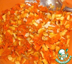 Смешать тертую морковь и измельченный репчатый лук. Добавить воду и тушить под закрытой крышкой 4-6 минут.