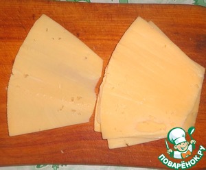 Сыр нарезать на тоненькие ломтики, у меня твердый сыр под названием "костромской", этот сыр мягче и в нем меньше дырочек, поэтому он хорошо скручивается в рулетики. В принципе можно взять любой другой сыр, который будет хорошо скручиваться.