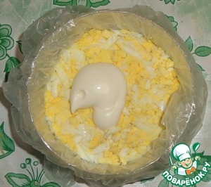 Выкладываем тертое на крупной терке яйцо. Майонез.