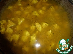 В горячую воду добавить 2/3 смеси приправ, растительное масло и курицу. Варить 30 минут.