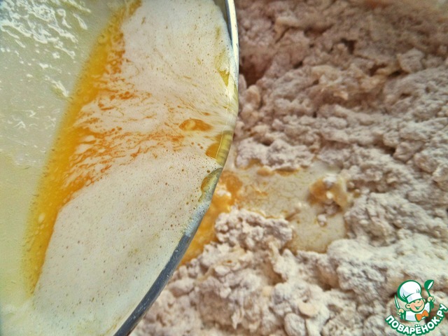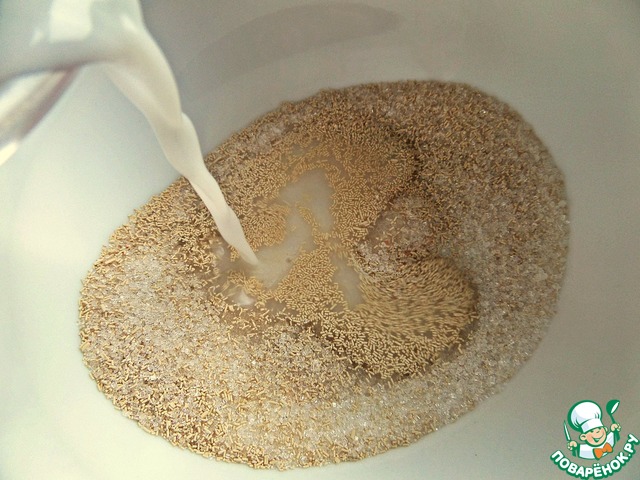 Вливаем тёплую воду или молоко, перемешиваем. У меня разбавленное молоко.
