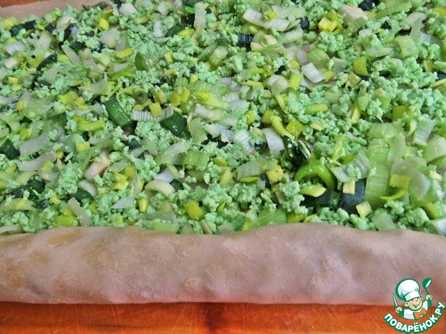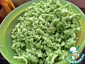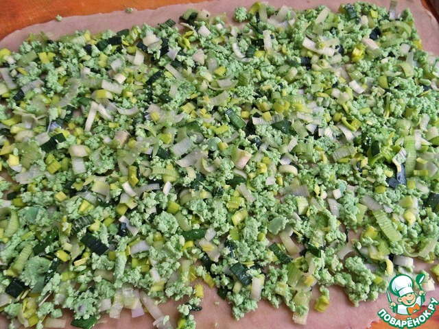 Пока делаем начинку. У меня был куплен сыр ручной работы с базиликом. Он напоминает творожный. Как вариант: берём обычный сыр, натираем тоже на тёрке и смешиваем для эластичности с творогом из пачки, будет примерно такая же текстура+базилик, кому нравится.