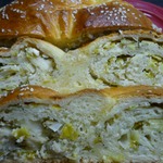 Форму застелить пергаментом, смазать его масло и перенести "улитку". Верх обильно смазать остатками яйца. Я ещё раз смазывала в процессе выпекания.