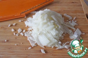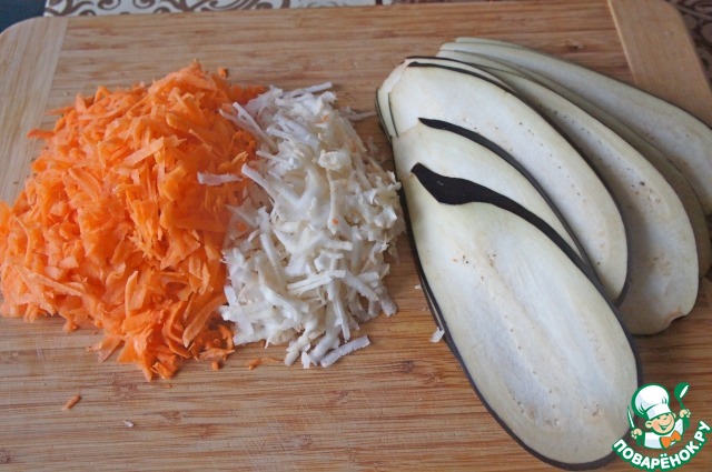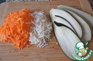 Баклажан нарезать на тонкие пластинки. Удобно это сделать при помощи овощерезки Бернера. Морковь и корень сельдерея натереть на крупной терке.