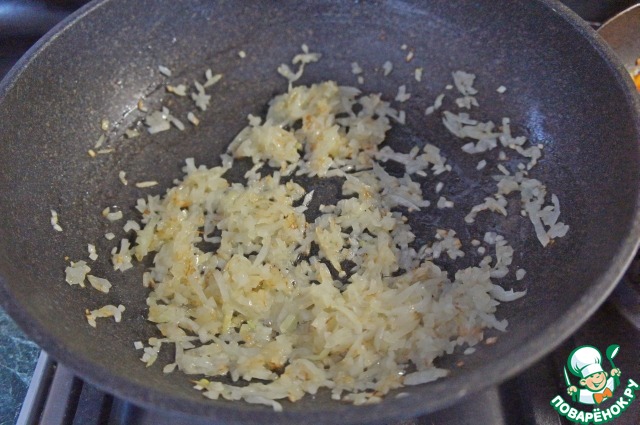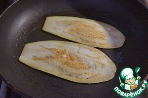 Баклажан слегка обжарить на сковороде с буквально парой капель растительного масла, чтобы пластины стали мягкими.