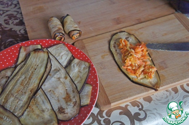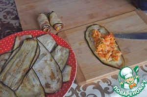Намазать пластинки баклажана начинкой и свернуть в рулетики.