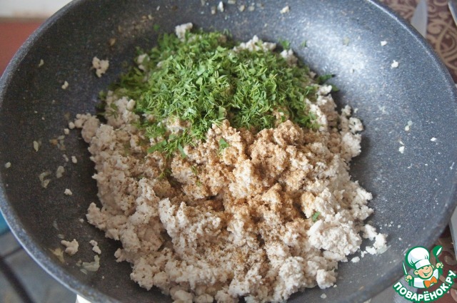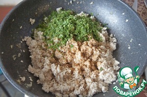 По вкусу посолить, поперчить, добавить молотый мускатный орех и зелень. Если получилось суховато, влить немного бульона или воды. Все перемешать. -