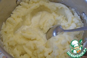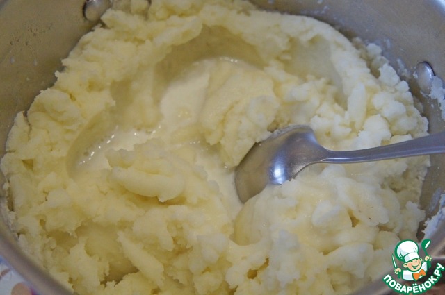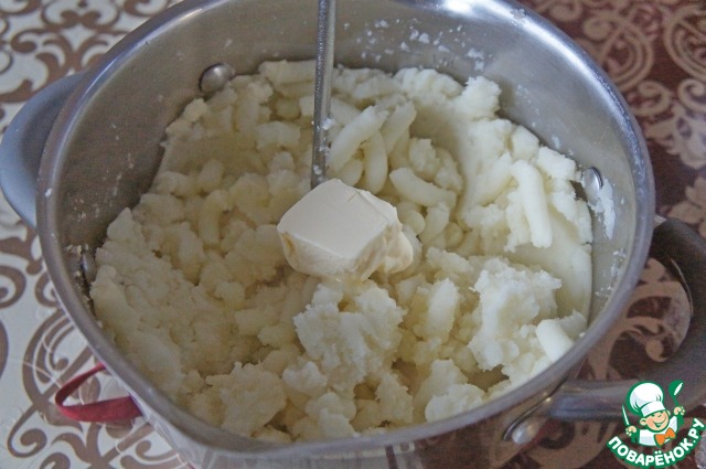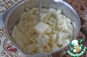Отвар слить, картофель подсушить, размять, добавить масло и перемешать. -