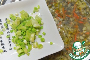 добавить в суп вместе с лаврушкой. Лавр через 5-7 минут достать, иначе бульон будет горчить.