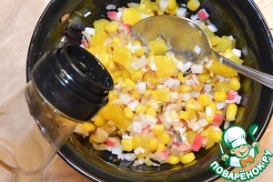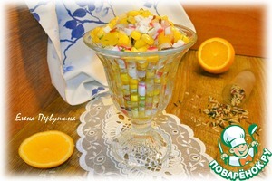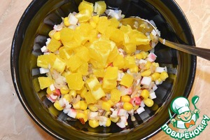 Апельсин почистить и нарезать кубиками. Добавить к остальным ингредиентам.