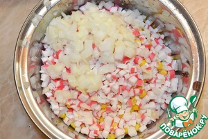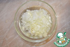 Лук нарезать кубиками и замариновать в уксусной водичке (100 мл воды + 1 ст. л. уксуса) на 10-15 минут.