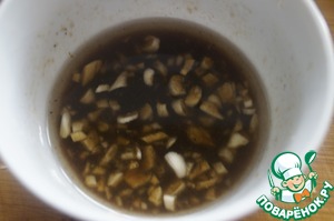 Приготовить маринад: смешать уксус, растительное масло, соевый соус, мелко порезанный или выдавленный через пресс чеснок. Поперчить.