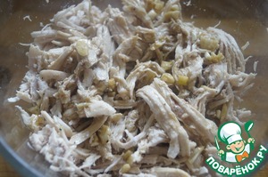 Половиной маринада полить куриное филе. Перемешать, накрыть пищевой пленкой и убрать в холодильник часа на 2.