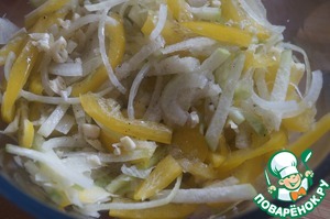 Редьку порезать соломкой или натереть на терке для корейской морковки (у меня ее к сожалению нет).