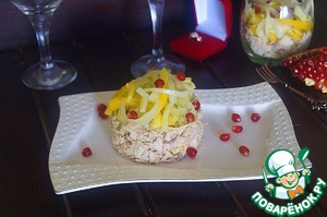 В сервировочное кольцо выложить куриное филе и хорошо прижать поверх произвольно выложить маринованные овощи, украсить зернами граната. Также можно подать этот салат в бокале.