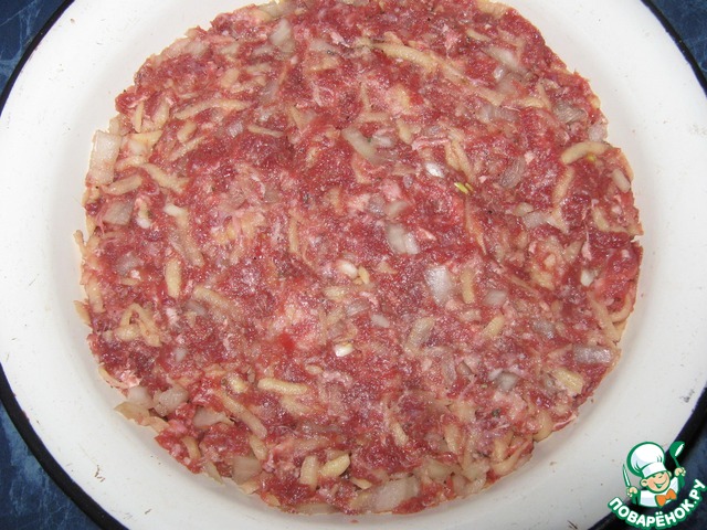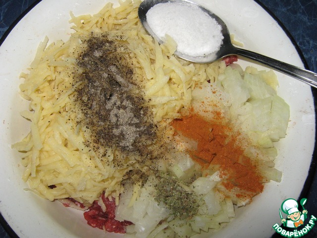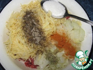 Натереть на крупной терке картофель, нарезать мелко лук, посолить, поперчить. Тщательно перемешать начинку.