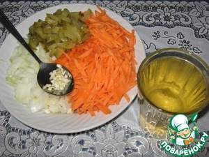 Морковь я натерла на корейской терке, огурец мелкими брусочками, лук и чеснок мелко нарезать, подготовить рассол.