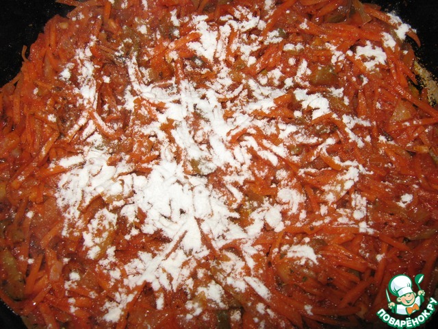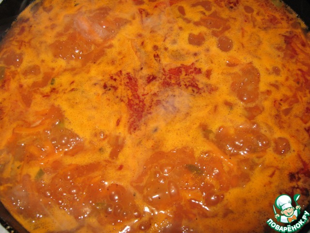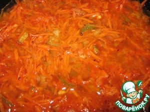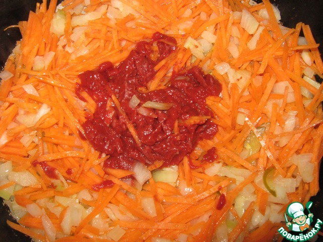 На масле обжарить лук и морковь. Добавить томатную пасту, обжарить.