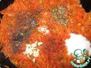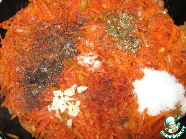 Добавить специи, соль, сахар, чеснок, перемешать.