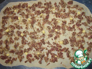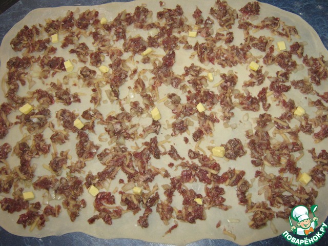 Тесто поделить на две части. Раскатать тонко в прямоугольник одну часть теста и выложить равномерно половину начинки и кусочки сливочного масла.