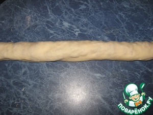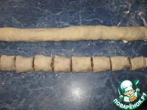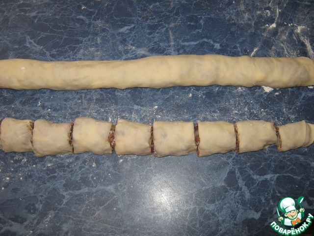 Из второй части теста и начинки свернуть второй рулет. Нарезать рулеты на кусочки толщиной 4 - 5 см.