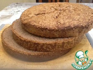 • Приступаем к сборке торта. Корж разрежем на 3 равные части.