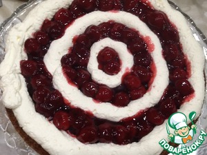 Затем из нашего кулинарного мешка на первую часть коржа отсаживаем три круга сливочного крема. Пространство между ними заполняем вишневой начинкой.