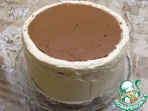Кладем сверху второй корж, сверху мажем шоколадным сливочным кремом.