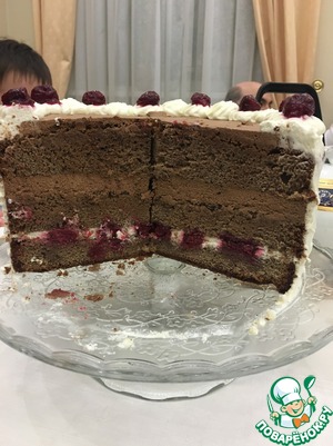 Шокодадный крем долго не хотел взбиваться. Использовпла сливки 33% Село зеленое, шоколад бабаевский 58% какао. Пришлось добавить специальные кондитерские сливки, только тогда дело пошло. Очень боялась перевзбить, но ничего, крем не расслоился. Сироп варила, но он не пригодился. Очень много сока вишня дала при варке. Пропитывала коржи вишневым сиропом.