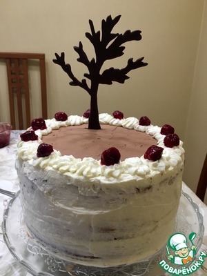 Убираем торт в холодильник на несколько часов. Достаем и украшаем по своему вкусу. Я украсила края торта оставшимся сливочным кремом и вишенками из вишневой начинки. Из растопленного шоколада сделала шоколадное дерево.