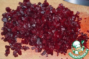 4. Остывшую свеклу почистить и нарезать мелким кубиком. Смешать с остальными ингредиентами.