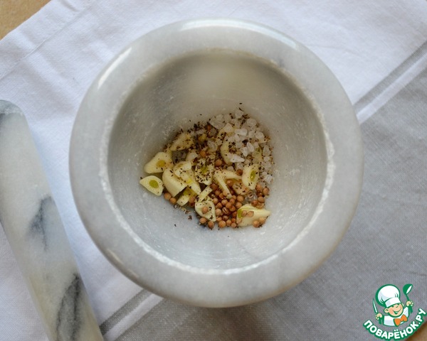 Нарезать мелко чеснок, смешать с солью (у меня крупная), перцем, кориандром. Хорошо растолочь всё в ступке.