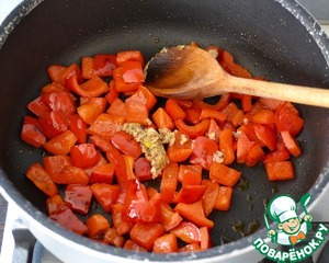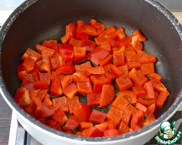 Перец вымыть и нарезать кубиками. Обжарить на растительном масле до готовности, около 7 минут.