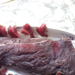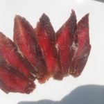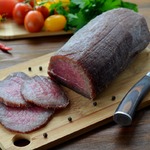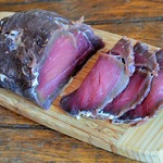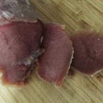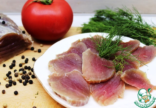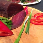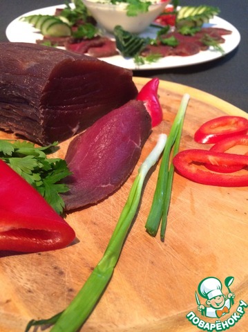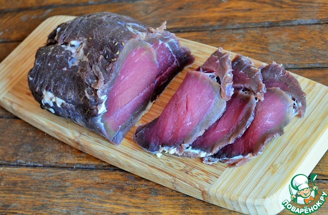 Такое мясо можно долго хранить на нижней полке холодильника Положите его на абсорбирующую бумагу и иногда переворачивайте. Не во что не заворачивать! И на любой праздничный стол у вас всегда будет в арсенале вкуснейшая закуска. Останется, только приготовить соус. Но, все же вкуснее всего оно свежеприготовленное в подаче с соусом. На фото – это первая стадия вымоченного мяса в водке, со временем оно будет темнеть. Приятного!!
