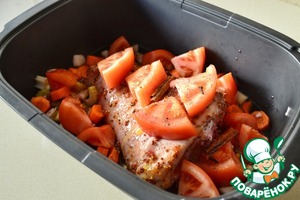 Добавляем нарезанные овощи к рульке, несколько кусочков помидора выкладываем на рульку.