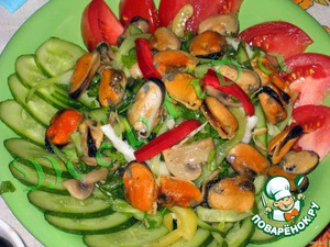 Быстрый необычный и легкий салат с остренькими мидиями, жареными шампиньонами, в обрамлении свежих овощей.