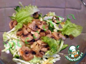 Сделать заправку: чеснок измельчить, смешать с измельченной зеленью, горчицей, лимонным соком, оливковым маслом. Заправить этой смесью огурцы, перец, капусту, грибы, листья салата и выложить горкой на тарелку.