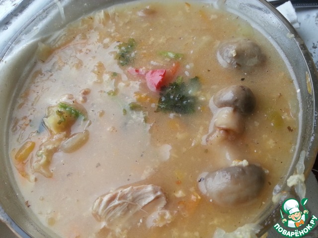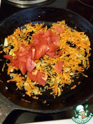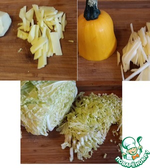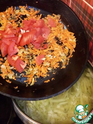 В готовый бульон добавить нарезанные савойскую капусту, картофель и кабачок, проварить 10-15 минут, добавить пшено и "зажарку" из лука, моркови и помидоров.