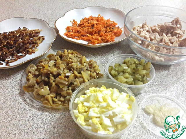 Шампиньоны нарезать мелко, обжарить, поперчить.