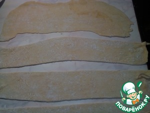 Раскатаем его в большой прямоугольник примерно 50 на 50 см (ширина рассчитывается так: ширину вашей прямоугольной формы для запекания стоит умножить на 5). Разрежем на 5 частей вдоль. У меня не очень аккуратные получились, но на вкусе и даже внешнем виде это не отразилось)