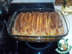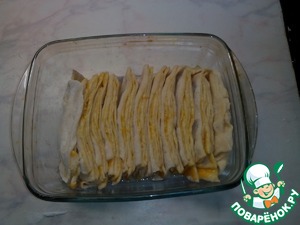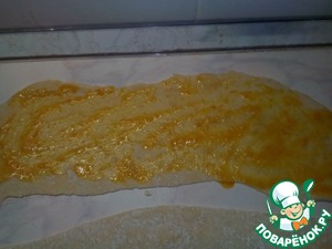 Смазываем каждый пласт начинкой и накрываем следующей полоской теста. Последний слой не смазываем.