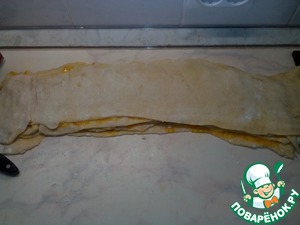 Выкладываем наше тесто в виде гармошки. Накроем полотенцем и оставим еще на 30-60 минут для расстойки.